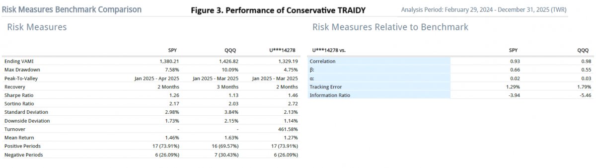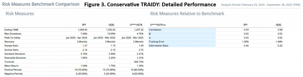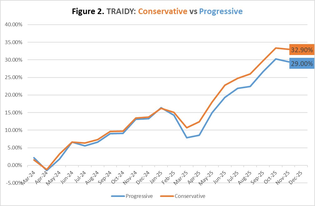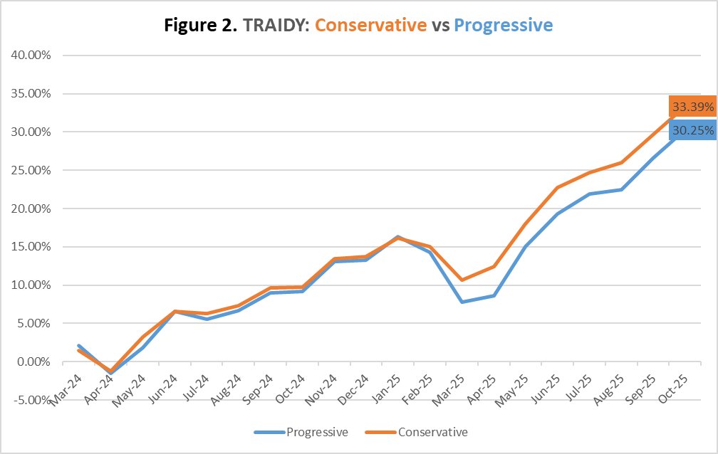 Figure 2 (TRAIDY: Progressive vs Conservative) provides a comparison between the cumulative results generated by the two versions since March 2024. The situation during the first half of 2025 provides an environment favourabale to the conservative version. This figure also shows that TRAIDY’s risk management is effective.