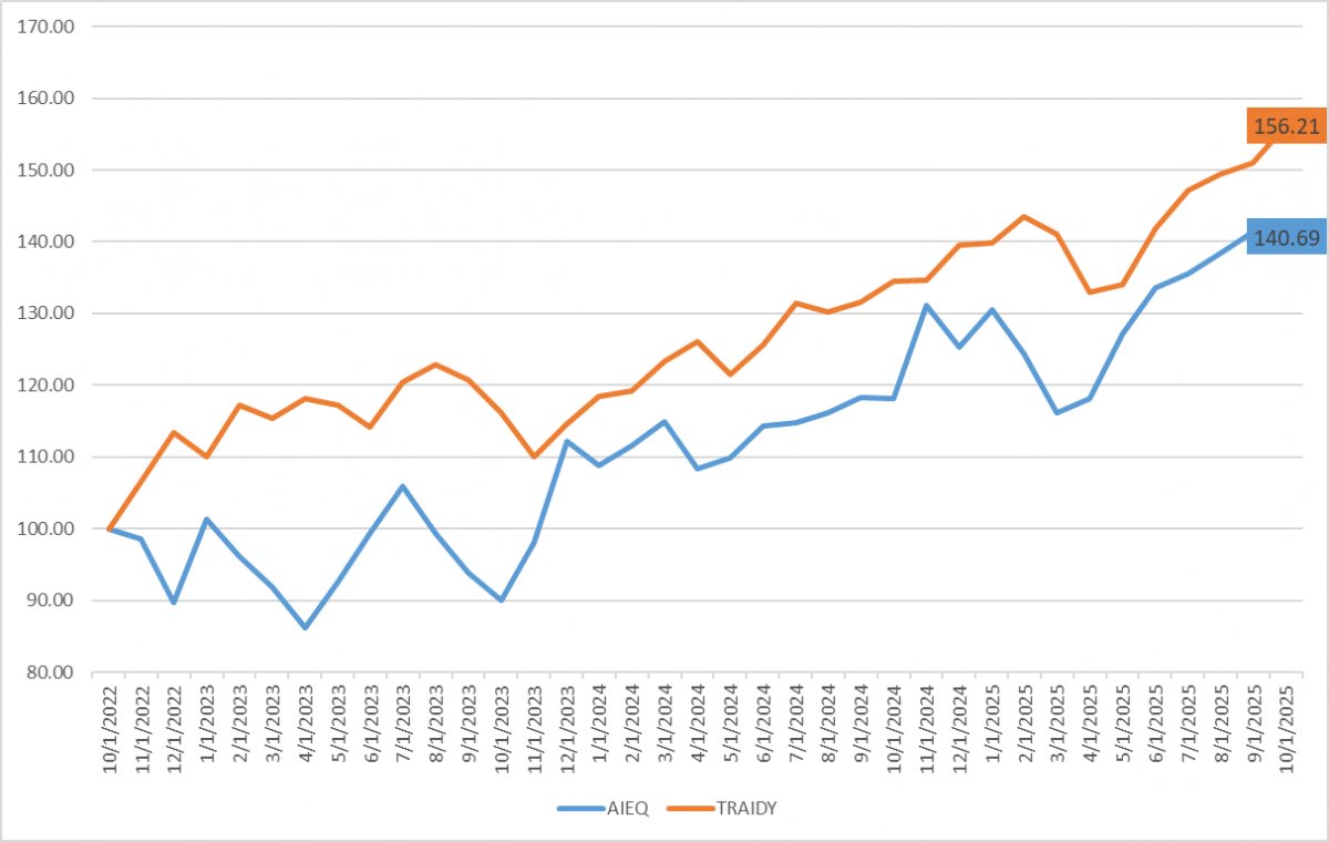We compared the performances of AIEQ and TRAIDY, especially as they are both applying AI to achieve results, the picture below shows this comparison: