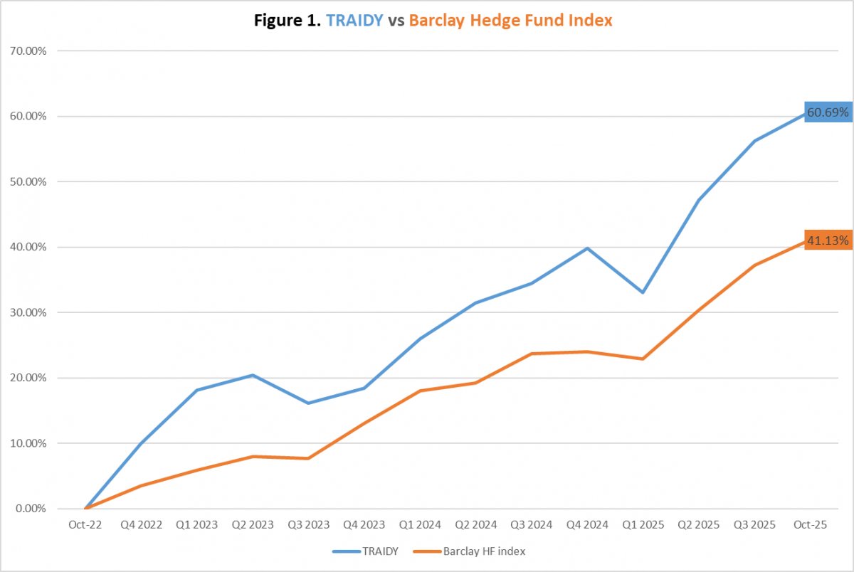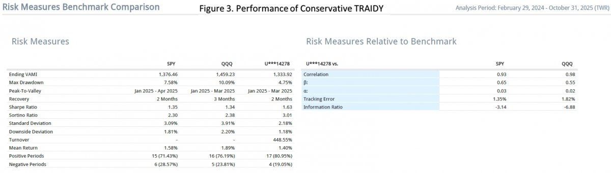 Figure 2 (TRAIDY: Progressive vs Conservative) provides a comparison between the cumulative results generated by the two versions since March 2024. The situation during the first half of 2025 provides an environment favourabale to the conservative version. This figure also shows that TRAIDY’s risk management is effective.
