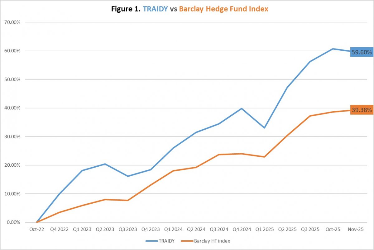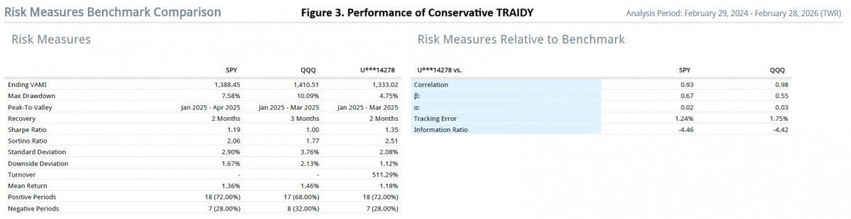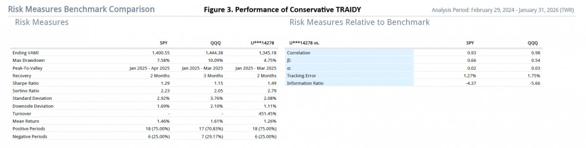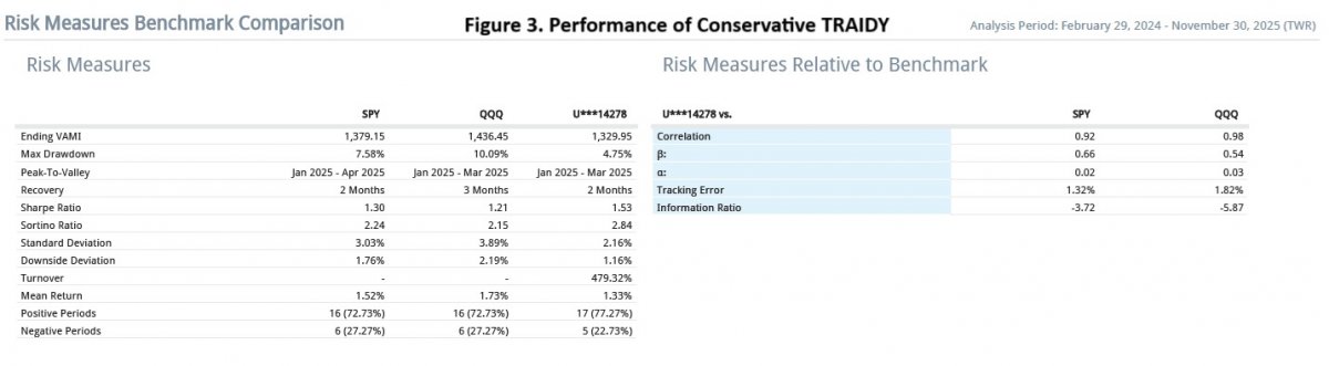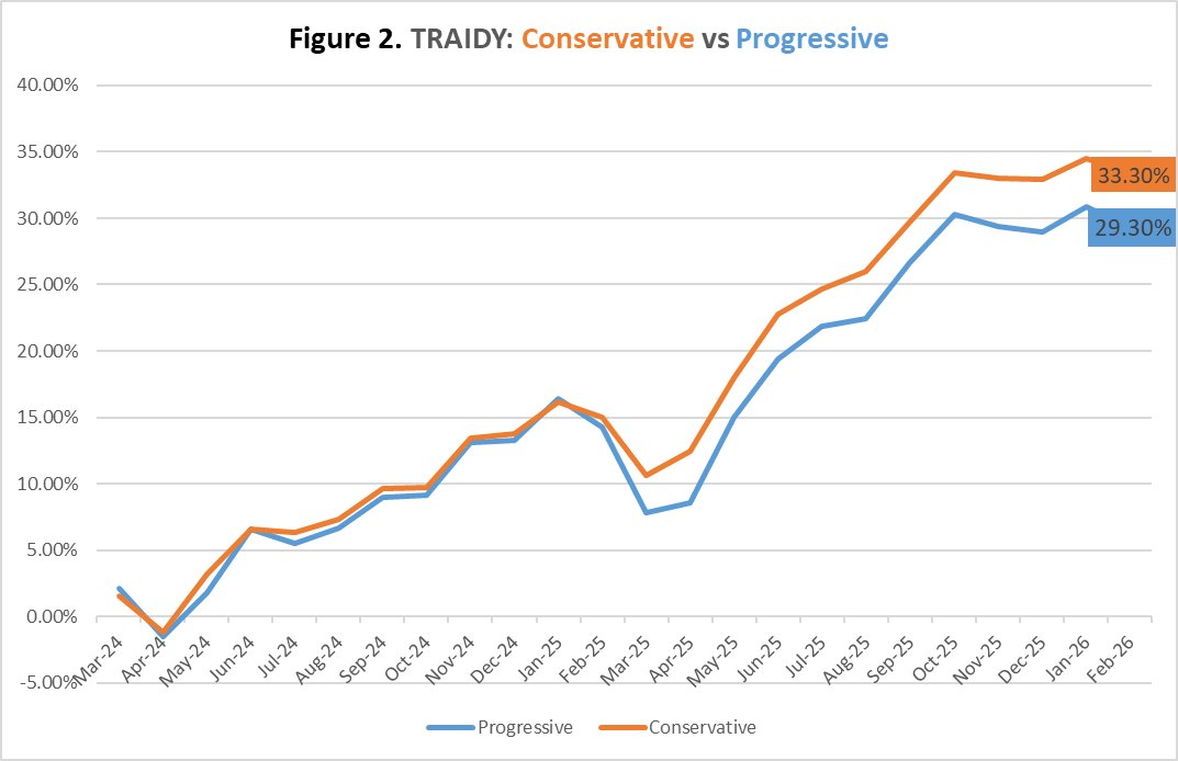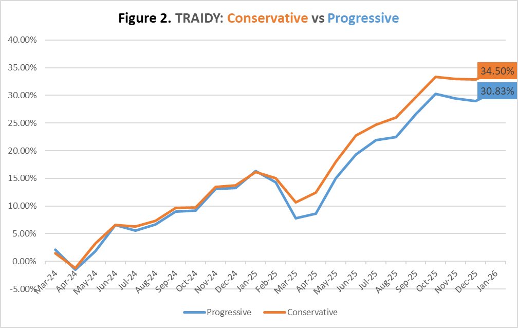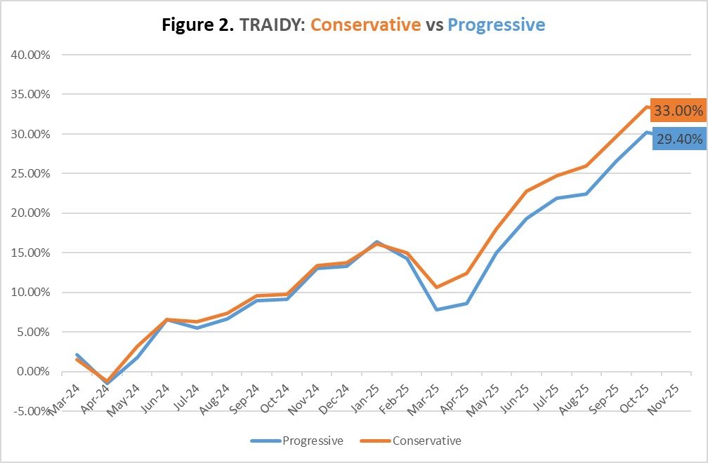 Figure 2 (TRAIDY: Progressive vs Conservative) provides a comparison between the cumulative results generated by the two versions since March 2024. The situation during the first half of 2025 provides an environment favourabale to the conservative version. This figure also shows that TRAIDY’s risk management is effective.